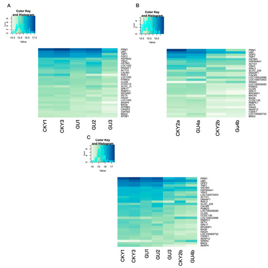 The top 30 genes expressed in the testicular tissue in the three comparisons are shown in Figure 2. Strikingly, eight genes, PRM1, UBC, TNP1, ODF2, HSP90AA1, YBX3, GSTM3, and ACTG1, were included among the top 10 genes in all three comparisons, suggesting that these eight genes are highly expressed in horse testes. As shown in Figure 2B,C, compared to normal DTs, UDTs exhibited downregulation of some genes, including TNP1, DNAAF1, CALM3, CLGN, SPA17, and RPGRIP1; these results reveal the existence of different expression patterns between normal and retained testes.