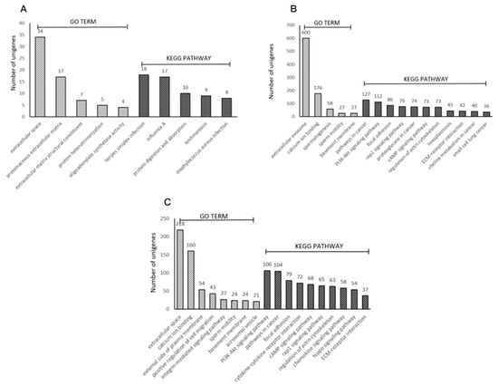 The RNA-seq technique enabled analysis of the differential expression profiles via analysis of the transcript abundance with a high sensitivity. When a p < 0.05 and a |log2 fold change| ≥1 were used as cutoffs, a total of 400, 5959, and 5324 DEGs, respectively, were identified in the three comparisons defined above. A total of 191 DEGs were downregulated in the Guanzhong horses compared to the Chakouyi horses while 219 DEGs were upregulated (Figure 3A). Sets of 3341 and 2618 transcripts were downregulated and upregulated in the CKY2b and GU4b testes, respectively, compared to the CKY2a and GU4a testes (Figure 3B). A total of 3049 genes were downregulated in UDTs (CKY2b and GU4b) compared to normal horse testes (CKY1, CKY3, GU1, GU2, and GU3) while 2275 genes were upregulated in these tissues (Figure 3C). Many genes showed differential expression between DTs and UDTs, as shown in Figure 3B,C, indicating that the expression of these genes might be associated with the reproductive performance of cryptorchids. The top 10 genes that were upregulated and downregulated in the three groups are shown in Tables S3–S5.