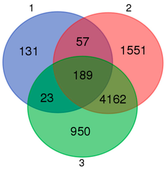 Venn diagram of the unigenes distributed in three groups. Group 1: DEGs between Guanzhong and Chakouyi horses; group 2: DEGs between DTs and UDTs of cryptorchids; group 3: DEGs between DTs of normal horses and UDTs of cryptorchids.