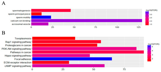 Various genes cooperate with each other to exercise their biological functions. Accordingly, we performed Kyoto Encyclopedia of Genes and Genomes (KEGG) analysis and Gene Ontology (GO) analysis for terms in the biological process, cellular component, and molecular function categories to further elucidate the biological functions of the DEGs. The DEGs were significantly enriched for 5, 5, and 8 GO terms and 5, 11, and 10 KEGG pathways that met the criterion of an FDR < 0.05 in the three comparison groups (Figure 5). The most significantly enriched GO terms were the extracellular space term (GO: 0005615) with 34 associated genes, the extracellular exosome term (GO: 0070062) with 600 associated genes, and the extracellular space term (GO: 0005615) with 218 associated genes (Figure 5). In particular, the DEGs enriched for the spermatogenesis, sperm motility, and acrosomal vesicle terms are associated with sperm structure and function. The KEGG pathway terms showing the highest levels of significance were the herpes simplex infection term (ecb05168) with 18 enriched DEGs, the pathways in cancer term (ecb05200) with 127 enriched DEGs, and the PI3K-Akt signaling pathway term (ecb04151) with 106 enriched DEGs (Figure 5).