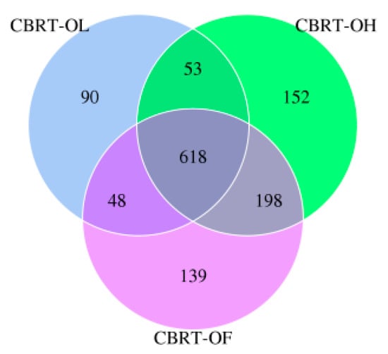 The OTUs of CBRT-OL (blue) was less than those of CBRT-OH (green) and CBRT-OF (purple). This means the microbiota of CBRT-OL was the lowest (Figure 1). The three groups shared the majority of OTUs.