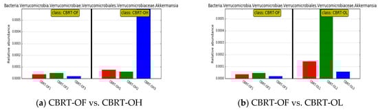 The number of dominant bacteria of FBRT-OL and FBRT-OH were more than those in CBRT-OL and FBRT-OH, respectively (Figure 8a,b). The relative abundance of Bacteroides in CBRT-OL (41.83%) was higher than that in FBRT-OL (19.55%); however, the abundance of Rikenellaceae_RC9_gut_group (6.06%) was lower than that in FBRT-OL (13.16%) (Figure 8a). Compared with CBRT-OF, FBRT-OF had more of the dominant bacteria Akkermansia (Figure 8c and Figure 9).