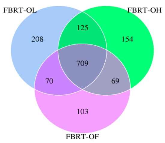 The OTUs of FBRT-OL and FBRT-OH were both more than those of FBRT-OF. This means that adding dietary fiber could increase the gut microbial diversity of free-range chickens. The OTUs of FBRT-OL were the highest (Figure 4), and this means the gut microbial diversity of the 2% lignocellulose group was the highest.