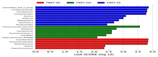 Compared with FBRT-OF, FBRT-OL and FBRT-OH both had more of the low abundance butyrate producers Roseburia and Faecalibacterium. Roseburia can also effectively degrade dietary fiber (Figure 5a,b). Compared with FBRT-OF and FBRT-OH, FBRT-OL had a low abundance of dominant butyrate-producing bacteria Megasphaera. The number of butyrate producers in FBRT-OH was more than that in FBRT-OF, including Faecalibacterium, Anaerostipes and Subdoligranulum (Figure 5c). However, at the genus level, the relative abundance of Bacteroides (33.54%) in FBRT-OF was higher than that in FBRT-OL (19.55%) and FBRT-OH (20.07%) (Figure 5b,c). At the species level, the relative abundance of B. caecigallinarum (11.15%) in FBRT-OF was higher than that in FBRT-OL (2.69%) and FBRT-OH (2.71%) (Figure 5b,c).