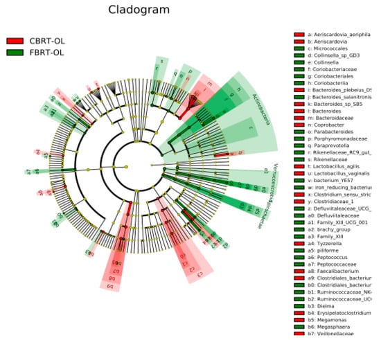 Because the α-diversity in FBRT-OL and CBRT-OL was significantly different, we plotted the evolutionary branch tree diagram between them according to the LEfSe results (Figure 10). Compared with CBRT-OL (red), the dominant bacteria in FBRT-OL was Actinobacteria (green).