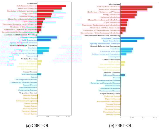 Next, we performed a functional prediction of OTUs in CBRT-OL and FBRT-OL. This showed that the function of gut microbiota of CBRT-OL (Figure 11a) was similar to that of FBRT-OL (Figure 11b). Both were focused on carbohydrate metabolism, amino acid metabolism, the metabolism of cofactors and vitamins, energy metabolism, membrane transport, and signal transduction.