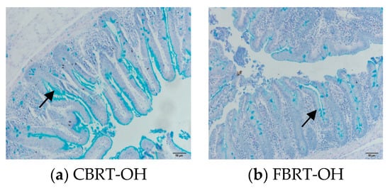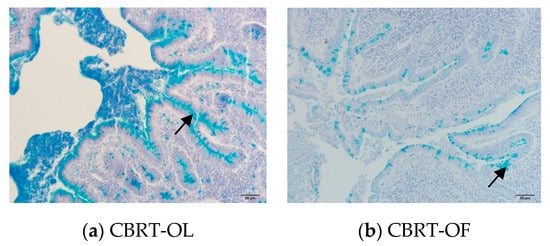 The blue substance is the mucus layer and is indicated by the arrows in the figures (Figure 12). Compared with CBRT-OF, the cecum inner mucus layer in CBRT-OL (Figure 12a and Figure 13a) and CBRT-OH was thicker (Figure 13a), and the thickness of the cecum inner mucus layer in CBRT-OL was significantly greater than that in CBRT-OF (p < 0.05) (Table 9) (Figure 12 and Figure 13a). This suggests that adding dietary fiber could increase the thickness of the mucus layer of the cecum. This was consistent with the results that showed that the relative abundance of Akkermansia in CBRT-OL and CBRT-OH were both increased compared to that in CBRT-OF. There was no difference in FBRT in the thickness of the cecum mucus inner layer (Figure 13b).