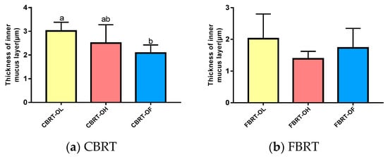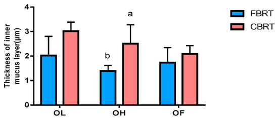 Histograms of the thickness of the cecum inner mucus layer in CBRT and FBRT. a and b represent a significant difference in the groups.