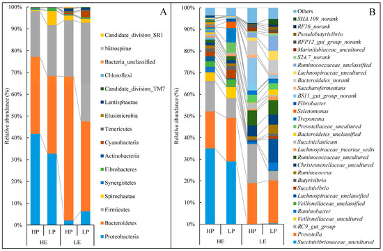 Effects of dietary energy and protein levels on phylum-level (A) and genera-level (B) composition of the rumen microbiota, represented as average abundance per diet. HE, high energy level, ME = 10.9 MJ/Kg; LE, low energy level, ME = 8.6 MJ/Kg; HP, high protein level, CP = 15.7%; LP, low protein level, CP = 11.8%.