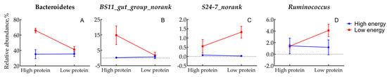 Interaction effects between dietary energy and protein levels on the relative abundance of Bacteroidetes (A), BS11_gut_group_norank (B), S24-7_norank (C), and Ruminococcus (D). High energy level, ME = 10.9 MJ/Kg; low energy level, ME = 8.6 MJ/Kg; high protein level, CP = 15.7%; low protein level, CP = 11.8%.