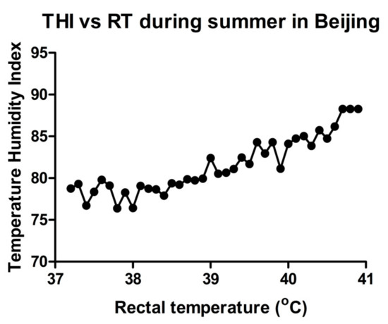 The relationship between ambient temperature and rectal temperature (RT) has been studied extensively. In Florida, temperatures of 29.7 and 31.4 °C were correlated with an average RT of 39 °C (mild hyperthermia) and 39.5 °C (hyperthermia), respectively [22]. RTs greater than 39 °C represent a degree of HS that affects milk production and fertility [23,24]. Relative humidity (RH) also contributes to the intensity of HS in addition to the ambient temperature. Efforts were made to incorporate environmental factors into a single index, but the ratio of success was limited except for the temperature humidity index (THI) [25]. For instance, during the summer, we collected the data from many dairy farms in Beijing. THI was calculated based on the following formula [26]: