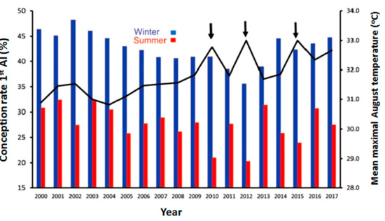 Conception rates of cows in dairy farms after the first insemination during the months of January–March (winter) or July–September (summer) of 2000–2017. The black curve represents the average environmental temperatures during August for each year. A noticeable decline in conception rates was observed during the intense conditions of summer in the years of 2010, 2012, and 2015.