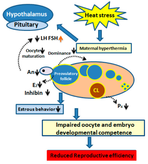 Diagram elucidating the interaction between the impact of seasonal heat stress and the hypothalamus–pituitary–ovarian axis and its mechanism of affecting dairy cow fertility. The lower luteinizing hormone (LH) surge is related to a decreased secretion of follicular estradiol (E2). Lower levels of androstenedione (An) and E2 levels are responsible for decreasing the dominance of preovulatory follicle and is related to poor estrous behavior. Likewise, impaired concentrations of follicle-stimulating hormone (FSH) and inhibin are related to the increased number of medium-sized follicles. Impaired competence of maturing oocyte and developing embryo is due to the disturbed nuclear and cytoplasmic maturation. Reduced reproductive efficiency in dairy cows is the ultimate outcome of heat stress.