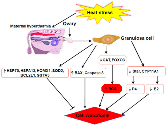Mechanisms of regulating heat stress response related to follicular function within bovine ovary. Upregulated genes caspase-3, superoxide dismutase (SOD), BCL-2, and BAX, and heat shock proteins (HSPs) (HSP70, HSPA13, HMOX1) are involved in the regulating mechanism of bovine GCs via induced or inhibited cell apoptosis. Under heat stress, downregulated genes CAT and fork head box O3 (FOXO3) were involved in the production of reactive oxygen species (ROS). Likewise, downregulation of steroidogenic acute regulatory protein (STAR) and cytochrome P450, family 11, subfamily A, polypeptide 1 (CYP11A1) were involved in the secretion of E2 and progesterone (P4). Moreover, the decline of E2 and the enhancement of ROS might, in turn, enhance the possibility of GC apoptosis and follicle function.