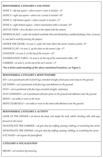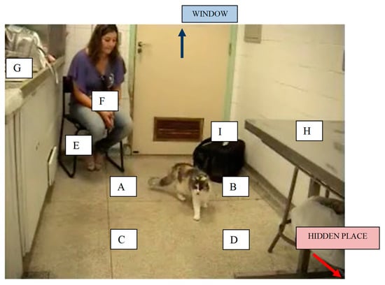 Behavioural categories and their definition (see Figure 1) were determined before video analysis started. Videos were analysed in terms of the cat’s location in the room (A, B, C, D, E, F, G, H, I, out of view, in the hidden place, see Figure 2), posture (stopped—sit, lie down, stand, cowered—moving normal, moving fearfully), activity (look at the owner, investigate the carrier, investigate the owner, eat food), and vocalization (meow). From a window in the door, it was possible to see the moment the cat went from out of view to the hidden place and thus one of the researchers recorded these times. Videos were evaluated by a “blind” observer who did not know any of the cats nor the purpose of the study. Coding was undertaken with the software Solomon Coder beta 11.04.23 (ELTE TTK, Department of Ethology, Budapest, Hungary).