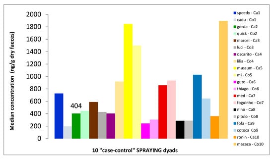Whilst “sprayer” cats had a median level of FCMs equal to 497 ng/g dry faeces (IQR = 497.75; n = 10), the median level of their “controls” was 545 ng/g dry faeces (IQR = 325; n = 10). One “case” cat (Mussum), and one “control” cat (Macaca) had levels clearly different from the rest of the group (i.e., Mussum = 1846 ng/g dry faeces; Macaca = 1894 ng/g dry faeces) and thus could be considered as potential outliers (Figure 3). However, given the large variation in FCM levels, and the fact that other cats approximated to the outliers in their values, we decided to keep them for the following inferential analysis. FCMs did not show significant differences when “case” and “control” cats were compared (Wilcoxon signed-rank test, p = 1.000).