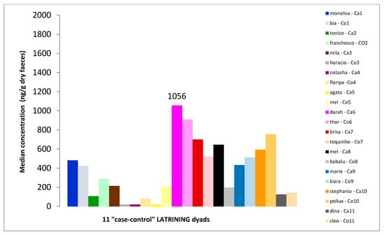 The owner of one dyad was unable to collect faeces of the cats as she never witnessed defecation of the participant cats. The results of the remaining 11 “case-control” dyads are therefore presented. While “latriner” cats had a mean level of FCMs equal to 399 ng/g dry faeces (SD = 333; n = 11), the mean level of their controls was 369 ng/g dry faeces (SD = 283; n = 11) (Figure 4). FCM levels of “case” and “control” cats did not show significant differences (Student paired t-test, p = 0.625).