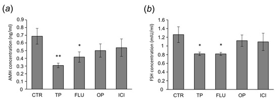 Plasma AMH concentration decreased following neonatal TP (p < 0.01) and FLU (p < 0.05) administration when compared with the control group (Figure 1a). Plasma FSH level was diminished (p < 0.05) in both TP- and FLU-treated groups than in the control group (Figure 1b). OP or ICI treatment did not alter the plasma levels of AMH and FSH (Figure 1a,b, respectively).