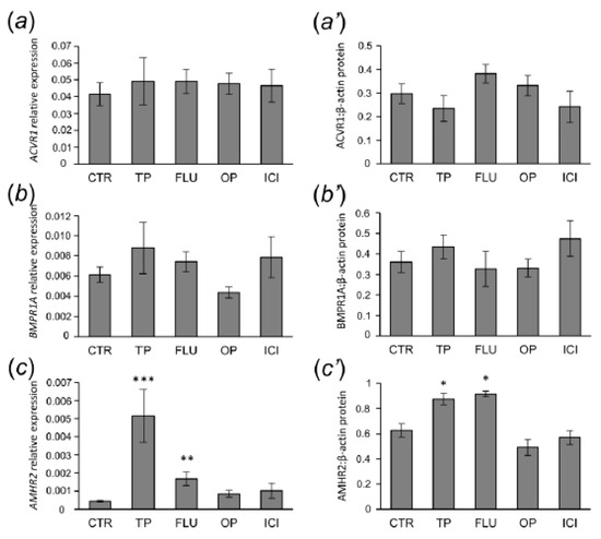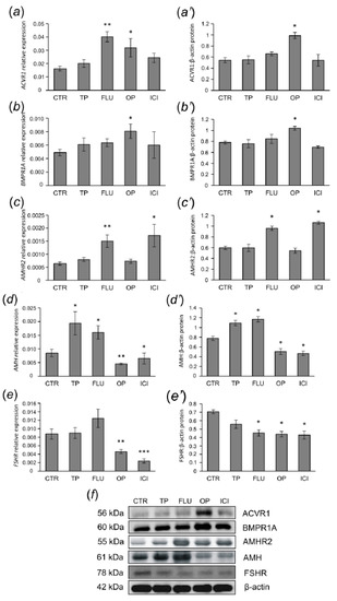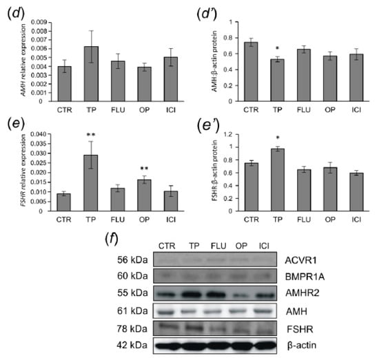 The expression of ACVR1 mRNA increased both in the FLU- and OP-treated groups (p < 0.01 and p < 0.05, respectively) in comparison to the control group (Figure 3a). However, ACVR1 protein abundance was higher only in the OP-treated group (p < 0.05) when compared to the control one (Figure 3a’). BMPR1A mRNA and protein levels markedly increased (p < 0.05) in the OP-treated group (Figure 3b,b’, respectively). AMHR2 mRNA levels were markedly greater both in the FLU- and ICI-treated groups (p < 0.01 and p < 0.05, respectively) when compared to the control group (Figure 3c). Treatments with FLU and ICI also led to significantly higher (p < 0.05) AMHR2 protein levels than the control group (Figure 3c’). AMH mRNA and protein levels were markedly increased (p < 0.05) in the TP- and FLU-treated groups (Figure 3d,d’). On the contrary, administration of OP and ICI resulted in a significantly lower mRNA expression (p < 0.01 and p < 0.05, respectively) and protein abundance (p < 0.05) of AMH compared to the control group (Figure 3d,d’). The expression of FSHR mRNA markedly decreased both in the OP- and ICI-treated groups (p < 0.01 and p < 0.001, respectively, Figure 3e), while FSHR protein abundance was lower in the FLU-, OP-, and ICI-treated groups (p < 0.05, Figure 3e’) compared to the control group.