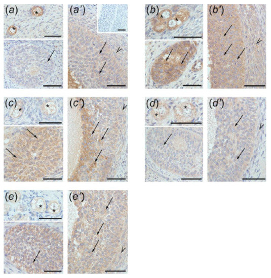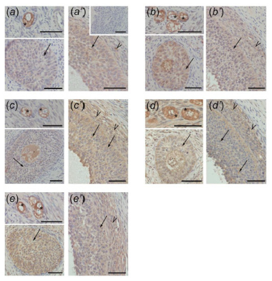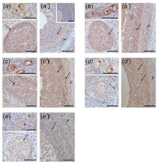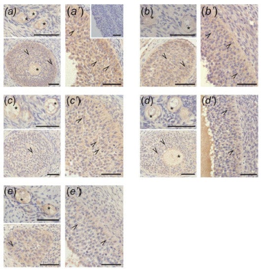 AMHR2 immunostaining in the preantral (a–e) and small antral (a’–e’) follicles obtained from control gilts (a,a’) and treated with testosterone propionate (b,b’), flutamide (c,c’), 4-tert-octylphenol (d,d’), and ICI 182,780 (e,e’). Immunopositivity was detected in oocytes (asterisks) and granulosa cells (arrows) of preantral follicles (a–e) as well as in both granulosa (arrows) and theca (arrowheads) cells of small antral follicles (a’–e’). Hematoxylin QS was used for counterstaining sections. Control sections showed no positive staining ((a’) inset). Bars = 50 µm.