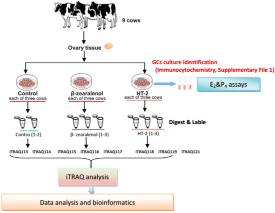 An overview of the experiment. Schematic diagram of the workflow of the isobaric tags for relative and absolute quantification (iTRAQ)-based proteomic experiments. The granulosa cells (GCs) were harvested from nine cows (three cows /group). The cows’ protein samples were pooled for proteomic analyses. For the proteomic assay, the peptides are labelled with different iTRAQ reagents, which contained the control group (113, 114), β-zearalenol group (115, 116, 117), and HT-2 group (118, 119, 121).