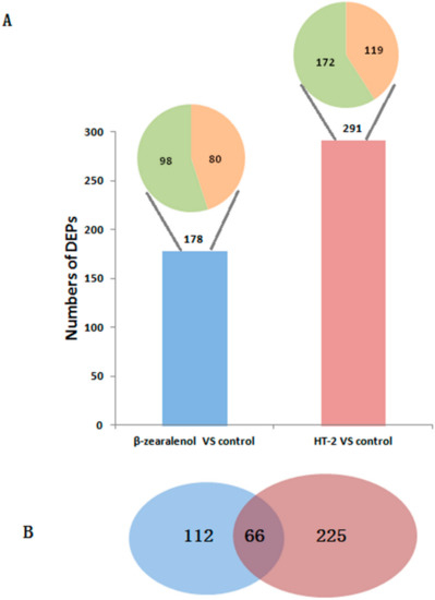 Number of differentially expressed proteins in β-zearalenol and HT-2 groups compared with the control group in GCs. The number above the bar indicates the number of proteins differentially expressed in different treatment groups (A). The pie chart represents the differentially expressed proteins (178 and 291), including upregulated differentially expressed proteins (DEPs) (orange) and downregulated DEPs (green). The Venn diagram of different expressed proteins in β-zearalenol (blue) and HT-2 groups (red) demonstrates the overlap between the protein populations in two groups (B).