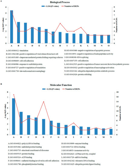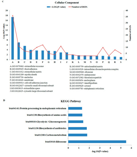 GO and KEGG enrichment analysis were performed with 66 DEPs. In GO analysis, we significantly enriched 23 biological processes terms (BP) (Figure 3A), 14 molecular functions terms (MF) (Figure 3B), 19 cellular components terms (CC) (Figure 3C), respectively (p < 0.05). Moreover, by matching DEPs to the KEGG and NCBI BLAST databases, we enriched six KEGG pathways (p < 0.05) (Figure 3D). In the BP terms, most DEPs were assigned to “translation”, “charperone mediated protein”, and “response to unfolded protein”. Moreover, “extracellular exosome”, “extracellular matrix”, and “nucleolus” were the predominant categories in CC terms. In the MF category, most DEPs were assigned to “binding” and “activity”. Figure 3D shows the KEGG pathway enrichment analysis of 66 common DEPs. In the analysis, a total of six pathways were significantly enriched.