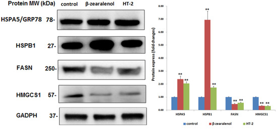 Western blotting analysis of the expression of heat shock proteins (HSPs) (HSPA5 and HSPB1) and other genes (FASN and HMGCS1) in the GCs. GADPH was used as a sample loading control. Values represent the mean ± S.D. ** p < 0.01 versus that of the control group.