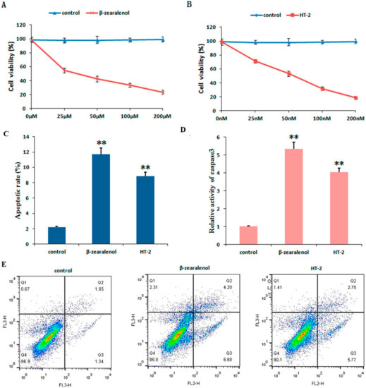 In view of the induction of apoptosis by β-zearalenol/HT-2 in several cell lines, we then examined whether early apoptosis occurred in β-zearalenol- or HT-2-treated GCs. As shown in Figure 5C, the untreated control GCs showed a spontaneous apoptosis rate of approximately 2%, indicating that GCs showed a low baseline rate of apoptosis. However, following the treatment of β-zearalenol or HT-2, the proportion of annexin V-positive cells increased to approximately 12% and 9%, respectively (p < 0.01). Moreover, the activity of caspases-3 was also analyzed to investigate the effects of β-zearalenol or HT-2 treatment on apoptosis of GCs. The results indicated that the caspase-3 activities in GCs were markedly increased compared to that of the control group (p < 0.01, Figure 5D).