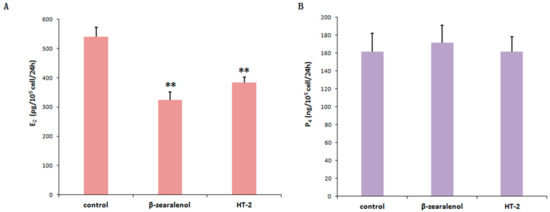 To further explore the effects of β-zearalenol or HT-2 on the ovarian function, we conducted in vitro experiments to investigate the effects on the production of E2 and P4. As shown in Figure 6, the content of E2 in β-zearalenol or HT-2 group was significantly lower than that in the control group (p < 0.01). Moreover, the result of progesterone level revealed no significant difference in the release of P4 between toxin-treated and control groups (Figure 6B).