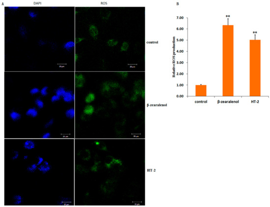 To study the direct effect of β-zearalenol or HT-2 on oxidative state, we analyzed the ROS level in GCs. We found that treatment with β-zearalenol or HT-2 enhanced the ROS accumulation in GCs (p < 0.01, Figure 7A,B).