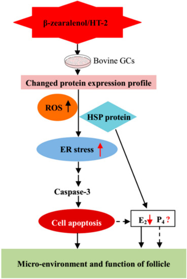 Schematic diagram of the effects involved in β-zearalenol and HT-2 mycotoxin-treated GCs. The proposed effects show that these mycotoxins could cause GC apoptosis, ROS-mediated ER stress, and impair hormone secretion, consequently disrupting the microenvironment and impairing the function of the follicle.