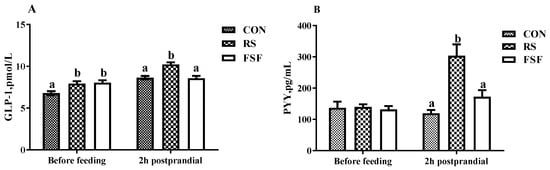 As shown in Figure 2, GLP-1 and PYY concentrations of 2 h postprandial serum of sows on day 70 of gestation were significantly (p < 0.05) increased in the RS group versus the CON or FSF group. Meanwhile, sows’ pre-prandial serum GLP-1 concentrations exhibited an obvious increase (p < 0.05) in the RS and FSF group, in contrast to no difference (p > 0.05) observed in their pre-prandial serum PYY concentration among the three dietary treatments.