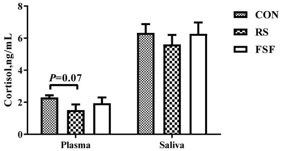 The three diet groups showed no significant differences (p > 0.05) in plasma and saliva concentration of sows’ pre-prandial cortisol on day 70 of gestation (Figure 3). However, compared with the CON group, the RS group showed a decreased tendency (p = 0.07) in the sows’ plasma cortisol concentration on day 70 of gestation.