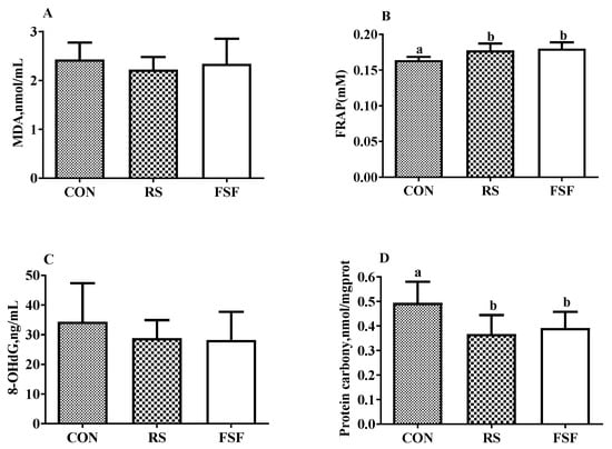 Dietary effects on sows’ serum levels of MDA (A), FRAP (B), 8-OHdG (C) and protein carbonyl (D) on day 109 of gestation. MDA = Malondialdehyde; 8-OHdG = 8-hydroxy-deoxyguanosine; FRAP = Ferric ion reducing antioxidant power. CON = control diet group; RS = 5% resistant starch diet group; FSF = 5% fermented soybean fiber diet group. Values are means ± SEM (n = 8). a,b Means with different superscript letters within a row differ significantly (p < 0.05).
