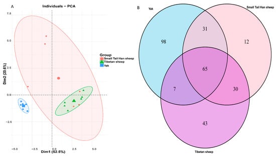 Two-dimensional Principal component analysis (PCA) based on Bray−Curtis distance metrics (A); Venn diagrams of OTUs composition (B).