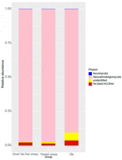 A total of 2 fungal phyla were identified, Neocallimastigomycota and Ascomycota. Among them, the Neocallimastigomycota was the most dominant phylum, accounting for 92.86% (± 0.094) of total sequences (Figure 3). The relative abundance of Neocallimastigomycota in the Tibetan sheep (97.44 ± 0.007%) and Small Tail Han sheep (90.65 ± 0.158%) was higher compared to that of yak (90.49 ± 0.035%, Supplementary Figure S1). The relative abundance of unidentified phylum in the yak (5.91 ± 0.02%) was significantly higher than in the Tibetan sheep (1.08 ± 0.007%) and Small Tail Han sheep (0.76 ± 0.004%, Benjamini−Hochberg p < 0.01, Supplementary Figure S1).