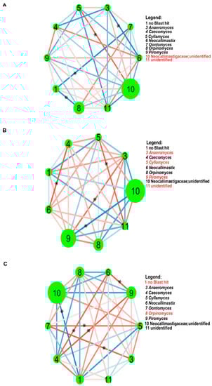 Finally, the inter-interactions of rumen fungi of each animal species were explored. As expected, each animal species had unique keystone species and the connectivity of network was different from each other. Specifically, genera Caecomyces and Cyllamyces had positive correlation in the Tibetan sheep network, which is similar to previous study on dairy cows [], that these two taxa co-occurred with each other. However, in the network of yak and Small Tail Han sheep, these two genera had negative correlation. These results suggest that the dynamic association of rumen fungi may be influenced by animal species. Moreover, the relationship between Cyllamyces and Piromyces was negative across animal species, which is inconsistent with the report on Nordic Red dairy cows [] where these two taxa had strong positive correlation, indicating that not only the animal species contributes to modulate the interaction of rumen taxa, but also the living environment play an important role in defining the dynamic associative patterns. In addition, most of the keystone species in the network were less abundant except that in the yak, and the stronger associations were always found between the less abundant taxa. These results indicate that non-dominant taxa may play an important role in the rumen ecosystem.