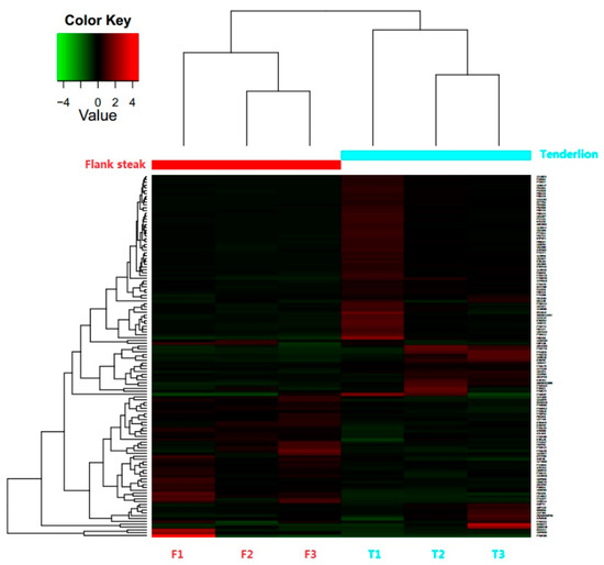Figure 1. Hierarchical clustering of differentially expressed proteins (DEPs) between tenderloin and flank steaks in beef cattle. Each row represents one protein. Columns F1, F2, and F3 represent samples from three technical replicates for flank steaks, and columns T1, T2, and T3 represent samples from three technical replicates for tenderloin steaks, and flank steaks in beef cattle samples belong to group F, whilst tenderloin steaks in beef cattle samples belong to group T. The expression levels of proteins are shown in red (up-regulated) and green (down-regulated).
