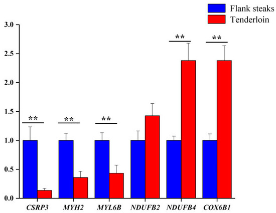 Figure 2. Validation of the gene corresponding to the differentially expressed proteins by quantitative real-time reverse transcription PCR (qRT-PCR). ** very significant differences between the tenderloin steaks and the flank steaks (p < 0.01).