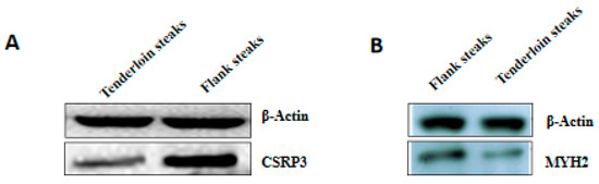Figure 3. The relative expression levels of CSRP3 (A) and MYH2 (B) proteins between tenderloin and flank steaks in beef cattle. β-actin was used as an internal reference protein.