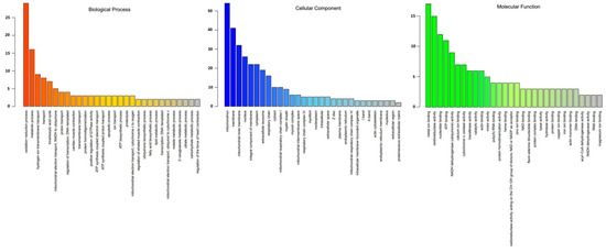 Figure 4. Gene ontology (GO) distribution of DEPs between tenderloin and flank steaks. DEPs are grouped into 30 categories according to biological process, cellular component and molecular function. The X-axis is the GO term, and the Y-axis is the number of differentially expressed proteins.
