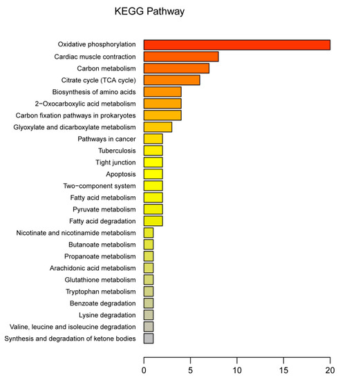 The 128 DEPs between tenderloin and flank steaks were functionally grouped into 30 annotation clusters. GO annotation of biological processes showed that most of the DEPs were linked to oxidation-reduction, metabolism, hydrogen ion transmembrane transport, transport, the tricarboxylic acid (TCA) cycle, mitochondrial electron transport, and the conversion of NADH to ubiquinone. The GO terms associated with the cellular component category indicated that many DEPs were related to mitochondria, membrane, mitochondrial inner membrane, and nucleus subcategories. For molecular function, metal ion binding, oxidoreductase activity, nucleotide binding and ATP binding were the main enriched GO terms (Figure 4). The KEGG pathway enrichment analysis indicated that 128 DEPs were related to oxidative phosphorylation, cardiac muscle contraction, carbon metabolism, the TCA cycle, the biosynthesis of amino acids, 2-oxocarboxylic acid metabolism, carbon fixation pathways in prokaryotes, glyoxylate and dicarboxylate metabolism, tight junctions, apoptosis, two-component systems, fatty acid metabolism, pyruvate metabolism, fatty acid degradation, nicotinate and nicotinamide metabolism, butanoate metabolism, propanoate metabolism, arachidonic acid metabolism, glutathione metabolism, tryptophan metabolism, lysine degradation, and valine, leucine, and isoleucine degradation (Figure 5). Thus, the DEPs were mainly associated with the energy and amino acid metabolism.