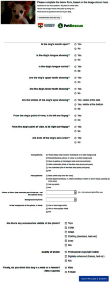 The scoring system underwent numerous refinements and was finally developed as a web-based form (Figure 1). This system facilitated the collection of data from volunteers who were asked to read the information regarding the research before commencing. Human Research Ethics Committee approval was not requested for this volunteer activity, mediated by PetRescue. The form explored relevant photographic attributes by primarily using questions requiring a binary response. The questions about some attributes (such as coat colour, colour of irises and background of the photograph) were structured so that only mutually-exclusive answers could be submitted. Meanwhile, questions about other attributes (such as facial pattern, coat patterns and accessories in the photograph) were structured so that multiple answers could be selected.
