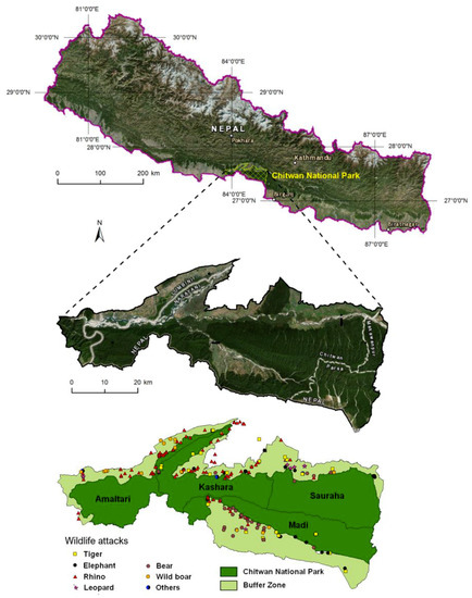 Since the establishment of protected areas elsewhere in the world, local communities have been restricted somehow or alienated from their traditional practices to use forest resources therein. Additionally, wildlife enters into human settlements and creates havoc by damaging crops, properties, and livestock. In Chitwan National Park (CNP) most poor people living near forests are of indigenous ethnicity and a lower caste, have no or few work opportunities, receive informal education and typically own a smaller piece of land, and survival problems are more acute for them than conservation issues. In places where people and wildlife share the same landscape for resource usage, wildlife leaves negative impacts on people and vice versa [1,2,3,4,5,6,7,8,9,10]. In addition, wildlife damage leads to resentment and people resort to retaliatory killings, even of endangered species. The human population in tiger (Panthera tigris) range countries in Asia has doubled in the last few decades and people increasingly come into contact with tigers [5,11] and other dangerous animals, especially in protected areas and their neighborhoods. In Nepal, CNP harbors the largest populations of most endangered and dangerous species, such as the rhino (Rhinoceros unicornis), tiger (Panthera tigris), sloth bear (Melursus ursinus), elephant (Elephas maximus), wild boar (Sus scrofa), leopard (Panthera pardus) and other wildlife, whose populations are on the rise [10]. From the narrow economic human welfare perspective, these endangered species are harmful to the communities and vice versa. It is a generally accepted fact that livelihood activities can undermine the long-term conservation objectives of parks—and this necessarily entails the integration of conservation efforts and activities with socio-cultural and economic objectives and the needs of indigenous people residing around the parks. One previous study [12] suggested that current policy does not address needy communities and that people have exploited buffer zone resources (e.g., arable land, water, timber, and plant biomass). Parts of CNP are inhabited by humans at densities ranging from 1 to 650 inhabitants/km2. A buffer zone has been established around each major area of wildlife habitat to protect that habitat and its wildlife from human activities emanating from nearby areas of high human density. Heinen and Mehta [13] stated that the buffer zone in Nepal has granted local participation but the managerial structure remains largely top down with regard to the Park’s Warden regulatory role. Other studies (e.g., tiger: [7,14] and elephant: [8,15]) addressed issues of wildlife attacks on people and recorded injury and death cases in the landscapes of CNP and its neighborhoods. However, there is no simple formula for combining conservation objectives with local needs [16]. According to Parker, Williams, and Turner [17], people’s behavior largely depends on incentives. People have dynamic relationships with wild animals: the outcomes of one or more events may strongly affect people’s attitudes and thereby shape their responses to interactions with a particular species [3,18,19,20]. Some wildlife species, such as large carnivores and mega-herbivores cause considerable harm to people as well as damage to their property [5,9,10,21,22,23]. These damages result in negative attitudes toward the species responsible for the losses [7,9,10,24,25]. An overlap of resource usage occurs between animals and people in the same landscapes. The establishment of protected areas (PAs) has come into direct conflict with traditional linkages and the immediate needs of local livelihoods. Wild animals have been moving out from the parks which has led to an increase in livestock depredation, crop damage, property loss and human injury or death in recent years [26].