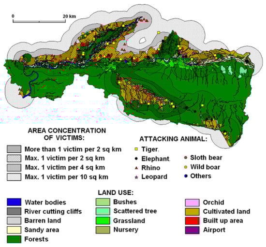 - Ruda, A.; Kolejka, J.; Silwal, T. GIS assisted predicting and risk zonation of wildlife attacks in the Chitwan National Park in Nepal. Int. J. Geo-Inf. 2018, 7, 369. [Google Scholar] [CrossRef]
