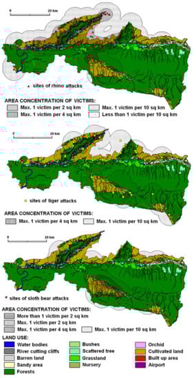 The widening of the operational area (from high to low victim density) shows the growing percentage of the forest as a scene of attacks. That means the forest is the key area where animal-human conflicts occur and people-victims move in cultivated land not usually close to neighbouring forests. Our research also shows that in the open-air environment (about 2/3 of the land where attacks occurred), with the predominance of cultivated land simulating natural wet areas (e.g., irrigated rice pads) and grassland (unitary mature agricultural crops before harvest), the majority of attacks take place. Basically, rhinoceroses prefer marshy land or water bodies to wallow and open grass land habitat [34]. They prefer to forage in grasslands and eco-tones (grasslands interspersed with mixed forests) and riverine (alluvial) mixed forests for resting [35]. Tigers inhabit diverse environments of the forest, open grasslands near water bodies, which corroborates the previous results [7,29]. Tigers in lowland forests prefer to inhabit the slopes of the Siwalik range and in rich grasslands and riverine forests they inhabit a series of valleys. Sloth bears need a forest in their background and come down to the lowland during the dry season and back to the upland in the wet season [37], which confirms our findings. In some areas of CNP and its neighbourhoods, sloth bears are more feared than tigers, due to their unpredictable nature. They are omnivores and come to forage in cultivated land. The relatively large percentage of forest (58%), cultivated land (19%), sandy area (11%) and grassland (4%) in elephant attacks operational zone shows the fact that elephants do not leave the woodland for large distances. Attack locations and percentage of open land together present attack sites as close-to-forest in open areas and close-to-open areas in forest locations, i.e., in the forest-open land buffer zone where human activities and elephant movements occur. Pant et al. [8] and Koirala et al. [15] state that elephants forage in forested areas and feed on cultivated crops such as bananas, rice, wheat, maize and sugarcane, which causes increasing conflicts with humans across their territory. We also indicated that wild boar attack operational zone is mostly found in cultivated land (60%) and based on GON [35] it shows the fact that wild boars live in the forest for their shelter, but commonly come to feed in cultivated land. On the contrary, the balance percentages of the sandy area, bushes (each 9%) and water bodies (5%), representing open or semi-open areas, showed such a relatively small animal´s preference for areas with long visibility. In relation to topological overview, a very large percentage of cultivated land (82%) in leopard attacks operational zone shows the fact that leopard prefers the fringe area in the forest (29%) for getting shelter close to built-up areas.