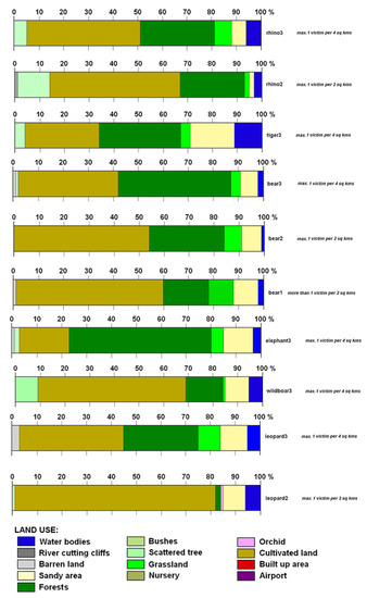 The locations of rhinoceros attacks reflect their wider range in the peripheral landscapes of Chitwan National Park. The occurrence of rhino attacks was the highest in numbers (n = 126) or approximately 40% of recorded victims between 2003 and 2013. The attack concentrations reached a maximum of 1 victim per 4 km2 on cultivated land, forest land, shrub land and water bodies across the territory (Figure 3). However, the exceptional cases of max. 1 victim per 2 km2 occurred in the Kashara and Amaltari sectors. The land use structure of rhinoceros attacks is given by the highest percentage of cultivated land, e.g., rhino2 (54%) and rhino3 (45%). However, the percentage of rhino3 and rhino2 was 29% and 25% respectively in the forest area followed by bush/shrub land and sandy areas (Figure 4). The rhinoceros attacks occurred in almost all land use categories in and around CNP. However, a remarkable feature is the relatively high percentage of barren land and water bodies and important percentages of river cliffs and orchards.