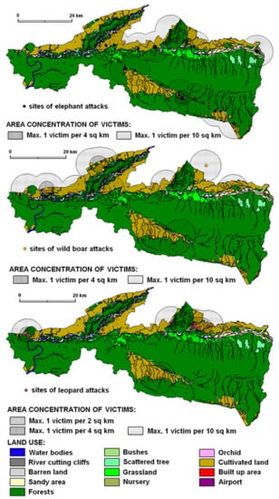 Elephant attacks concentration evidenced a maximum of 1 victim per 4 km2 in the landscape (Figure 5). Based on ANOVA results (p = 0.018), the land use structure of elephant attacks differs from the land use structure of other attacking animals. Especially the large percentage (58%) of HWCs in forest indicates woodland as the dominant attacking environment which is similar to sloth bear attacks within the same area of attacks (Figure 4).