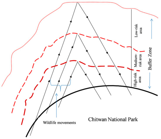Existing practices of buffer zone delineation need to be redesigned with an emphasis on the possible risks of wildlife damages. Alternative ways of conceptualizing the interactions between wildlife and local communities offered new perspectives of the buffer zone delineation. To propose the category of considering wildlife pressure on human-dominated landscapes a new solution was sketched out (Figure 6).
